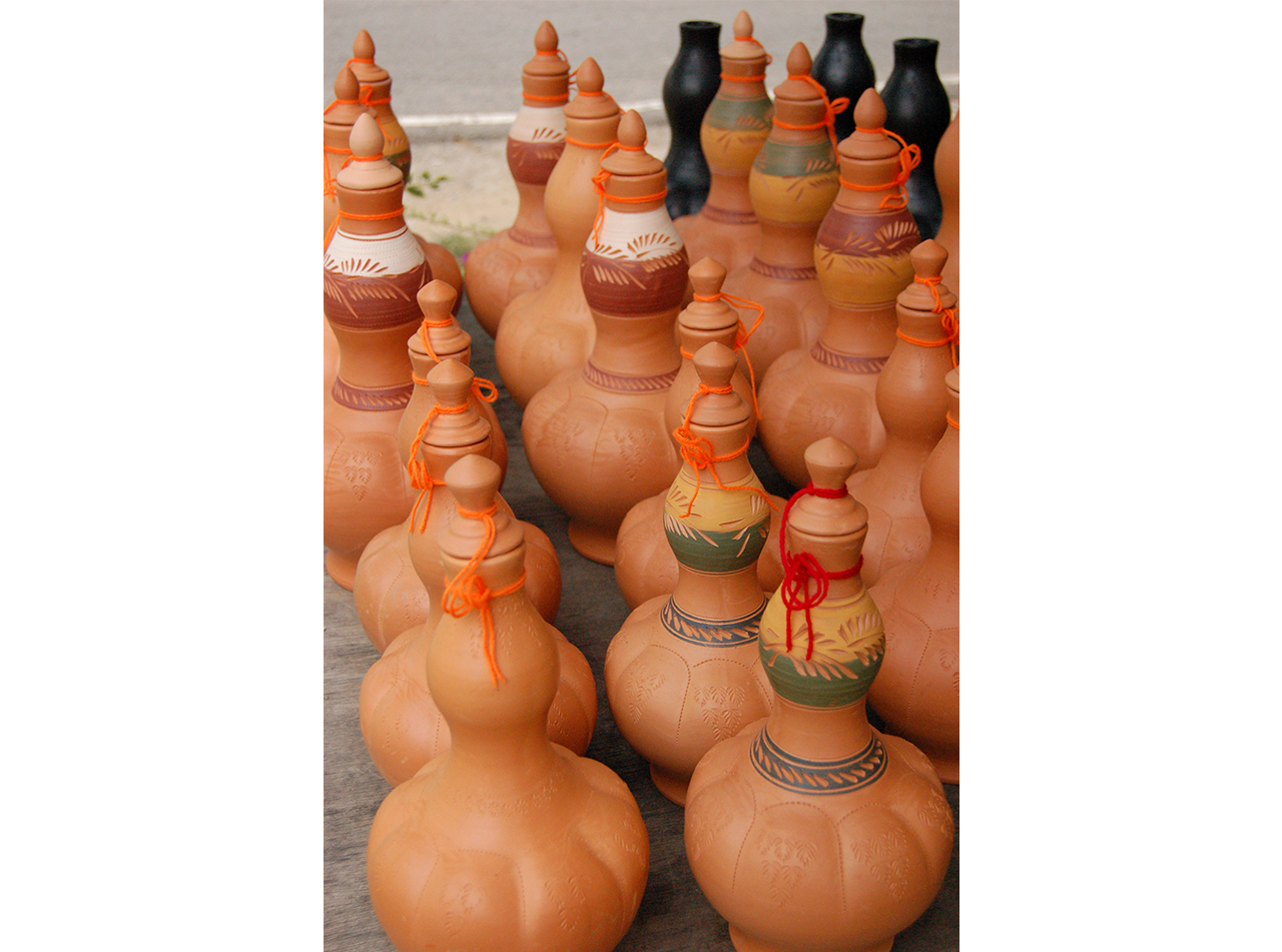 A “labu sayong” is a traditional clay water pitcher originating from the Sayong area in Kuala Kangsar in Perak, Malaysia. These pitchers have a gourd-like shape, tracing back to when Malays used gourds and pumpkins to store water. The clay material and shape of the pitcher cools water, while its medicinal properties help treat coughs and fevers. Labu sayong pitchers come in various designs with intricate patterns. There is a surviving ceramic enterprise in Kuala Kangsar whose crafters still practise the tradition of moulding the labu sayong by hand.