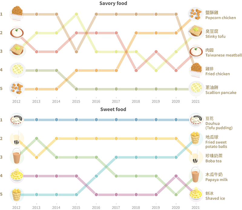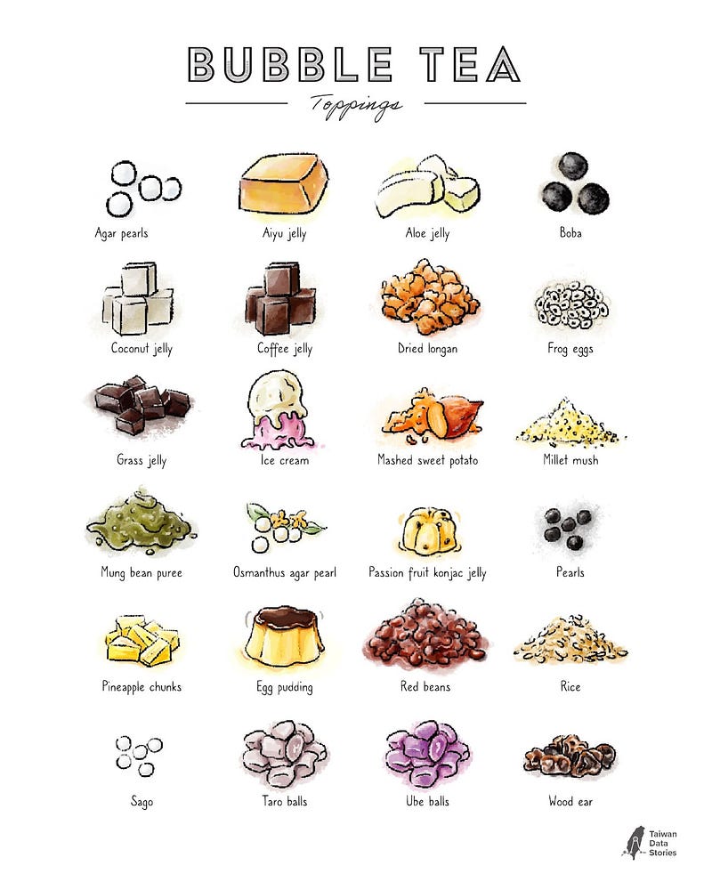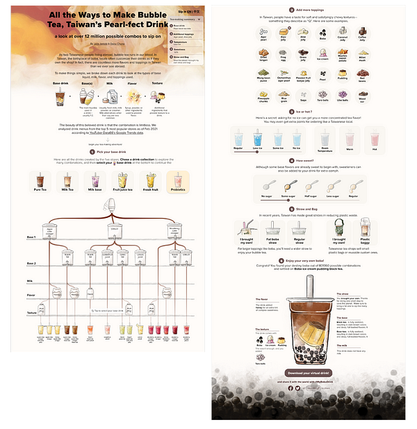We chose bubble tea for our story because it’s such a charismatic and representative drink of Taiwan, and we wanted to invite people outside the data viz space to experience this. There was lots of possible data to collect about this topic, like their trajectory of growth and how popular it’s become. We realised what was the most unique thing for someone growing up in Taiwan is how many different types of combinations you can have.