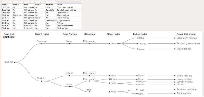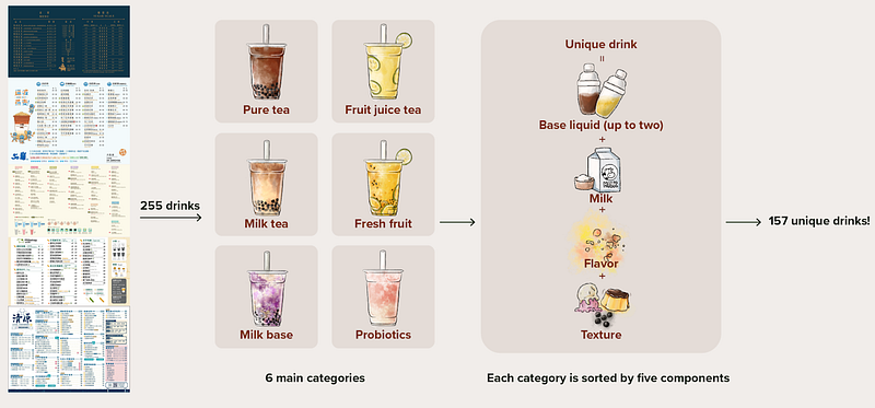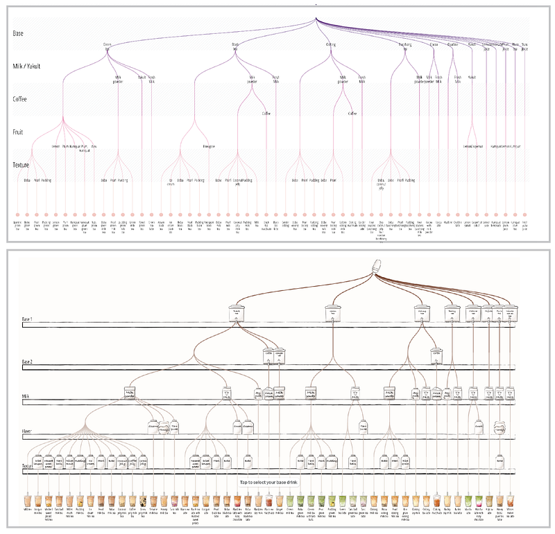 Figuring out the categories was really challenging. We picked the top five most popular bubble tea stores in Taiwan to get the data, but the stores all categorise their drinks in very different ways. Like, how do we define milk tea versus tea with milk powder versus tea with fresh milk? We cleaned the data for the five stores, and then tried to find the most unique combinations that would work across all of them. This project was very technically challenging; we still haven’t figured out how to make it mobile-friendly.