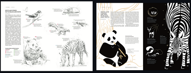 Another example would be this Black And White Animals piece in Nat Geo. To immediately engage the audience, I opted for a more stylistic approach so the images are very vectorised, which the expert researcher didn’t like. But I know my audience are not experts, they’re the general public, and they really engaged with it. So before you think about the style, think about the structure and always go back to: what is the point of this graphic? What kind of audience and purpose do I want to serve for this type of illustration?