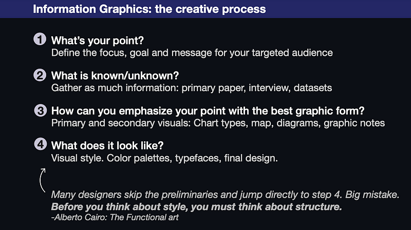 The data really shapes your story, but it’s also challenging because it’s not until you put in a data point and see what that format looks like that you’d know if it works, or what’s the main point you’re trying to make. So you have to iterate to find what’s the best graphic form that would work, and you need to clean up your data. Working with Surgo where I worked with data scientists, I found science illustration a lot clearer, whereas with data it all starts with mud. It makes Step 2 (gathering information) and Step 3 (finding the best graphic forms) of the creative process longer because you need more exploration.