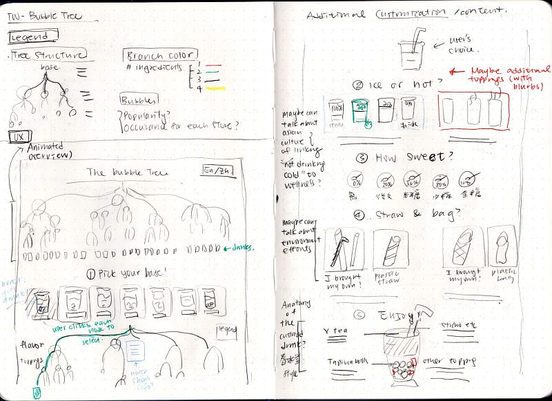 One day Julia showed me the boba hierarchy tree, and it inspired me — I immediately saw the curvy lines as flows of tea ingredients all cascading and colliding into the final product.