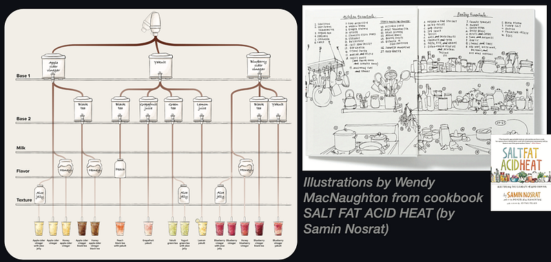 I was also inspired by Wendy MacNaughton’s illustrations of kitchen shelves in the book Salt Fat Acid Heat, and integrated boba store equipment for each node, to show the mixing experience.