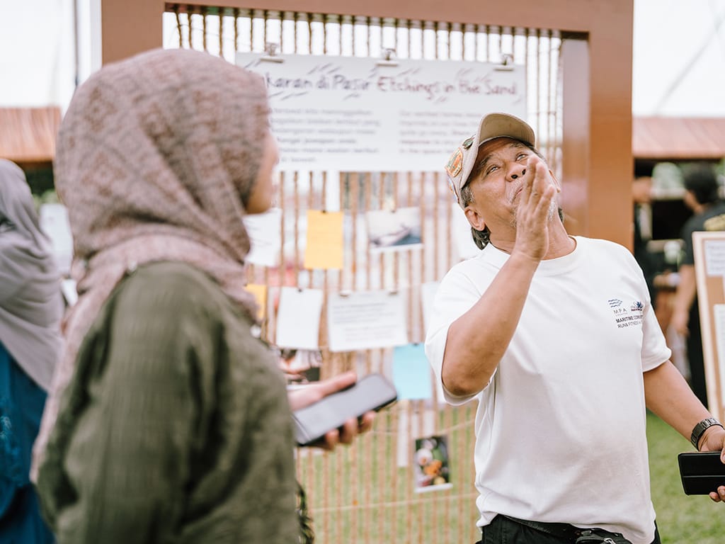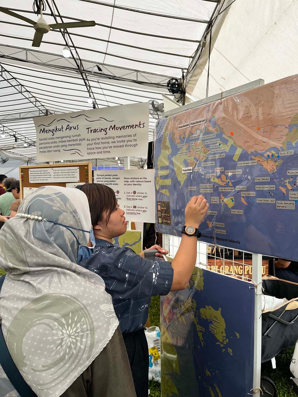 The lively chatter, wholesome exchanges, and festive music charged the air on Hari Orang Pulau. Curious visitors and onlookers were drawn to the maps of Nusantara, which organically became a storyteller’s enclave. The maps of Nusantara were the beacon of the booth; Orang Pulau and Orang Laut and non-islanders alike turned the humble 4x4m grass patch into an offbeat intergenerational space for connection, contemplation and curiosity.
