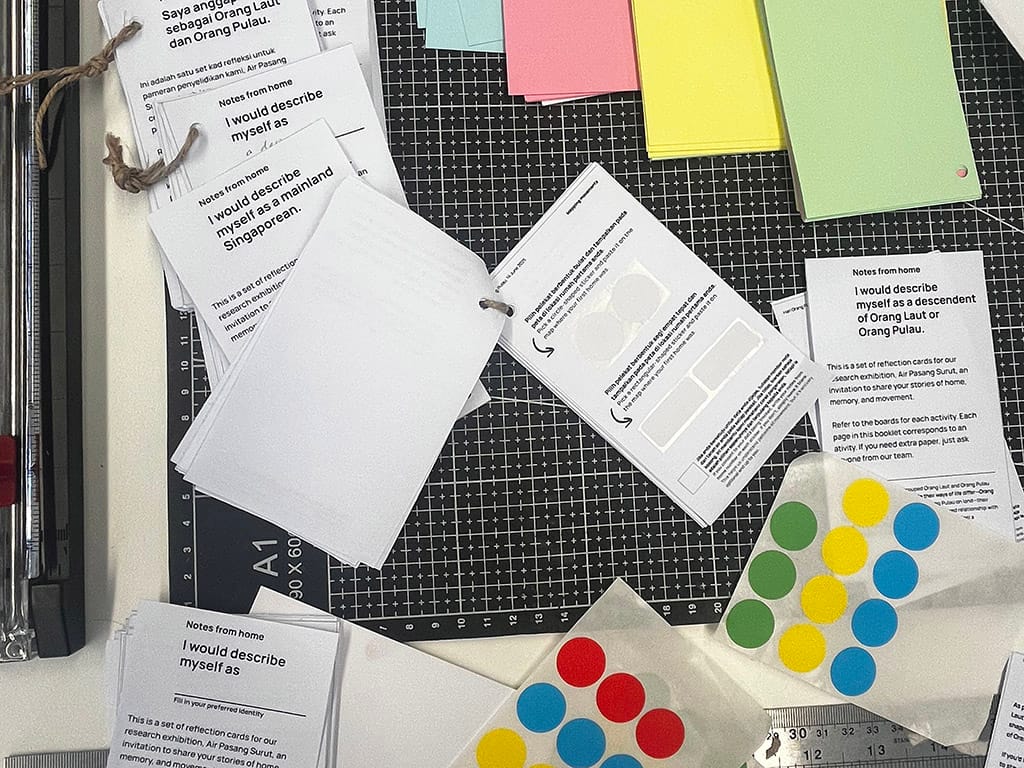 Testers received colour-coded note sets, each tagged to an identification number, to write their reflections to the exhibit’s prompts. This enabled us to trace responses based on identity groups. Some prompts were paired with photographs of the Orang Laut’s daily lives to aid memories. There were also three maps; of Singapore and the Southern islands, parts of Malaysia, and parts of Riau, where they could paste the locations of their first and current homes.