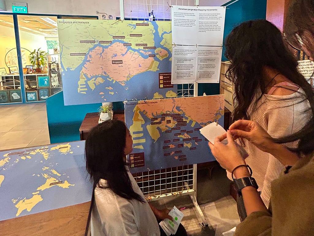 Left: Orang Seletar, Jefree Salim, adorned with his traditional headdress, sharing about his relocation and tie to the straits between Singapore and Johor. Right: Griselda helping to paste a sticker of where an Orang Laut’s first and current home is located at.