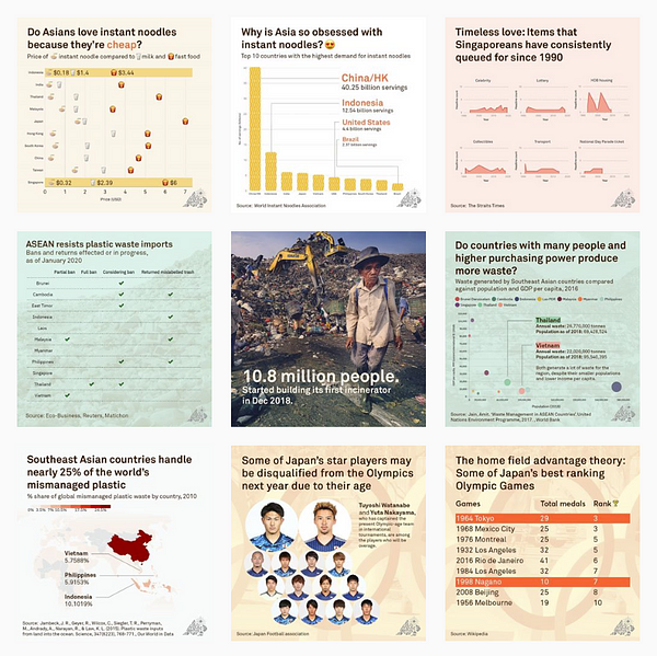 Instagram is a very visual platform, and one that people usually like to browse through quickly. As we honed our data storytelling skills and saw how other data visualisation creators like The Pudding and Gabrielle Mérite use the platform so effectively, we started looking into how we can repackage our stories’ data visualisations for Instagram.