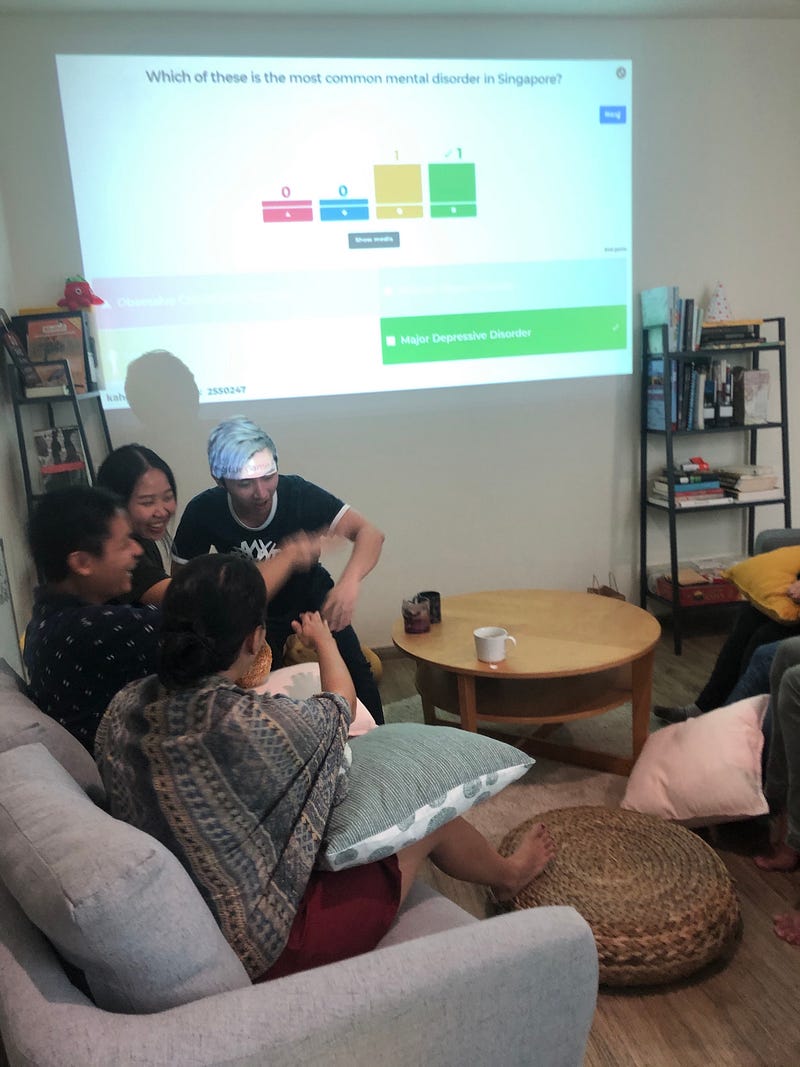 Mental health is a potentially sensitive subject, so we started with a short quiz to break the ice and test the team’s knowledge about mental illness—while also informing them of the mental health landscape in Singapore. The team was split in a battle between the “freshies” (Kenneth, Aishah, Gwyneth, and Griselda; all relative newcomers to Kontinentalist) and the “OGs” (Dylan, Rifqi, Joceline, and Dewi).