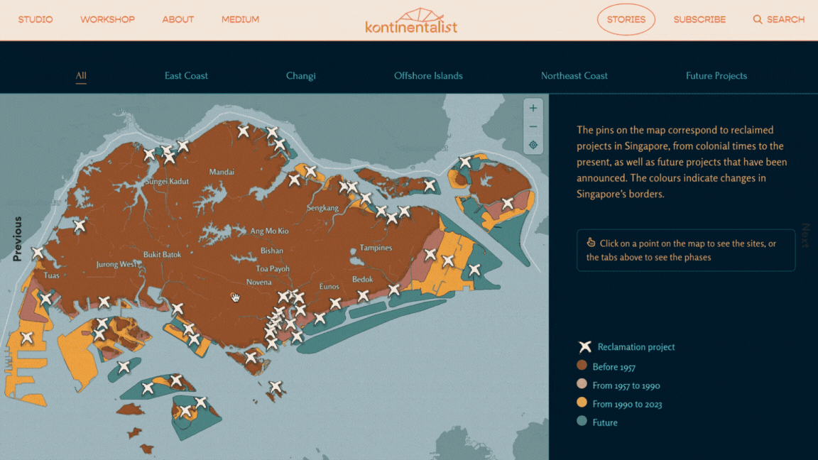 Our goal was to visualise a comprehensive timeline of land reclamation in Singapore that was as complete as possible—spanning from the earliest documented project before independence, to the most updated plans for the future. However, we quickly realised that there was no existing map that covered the full extent of our desired timeline, and so we stitched together data from four different maps, each analysing different periods in Singapore’s past, present, and future. This was however more challenging than expected, due to the discrepancies we found across the datasets. Even amongst verified government sources, reclamation projects were identified by different location names, years and land areas. It was just as difficult to ascertain the reliability of data on several projects, for which we could only find one source.