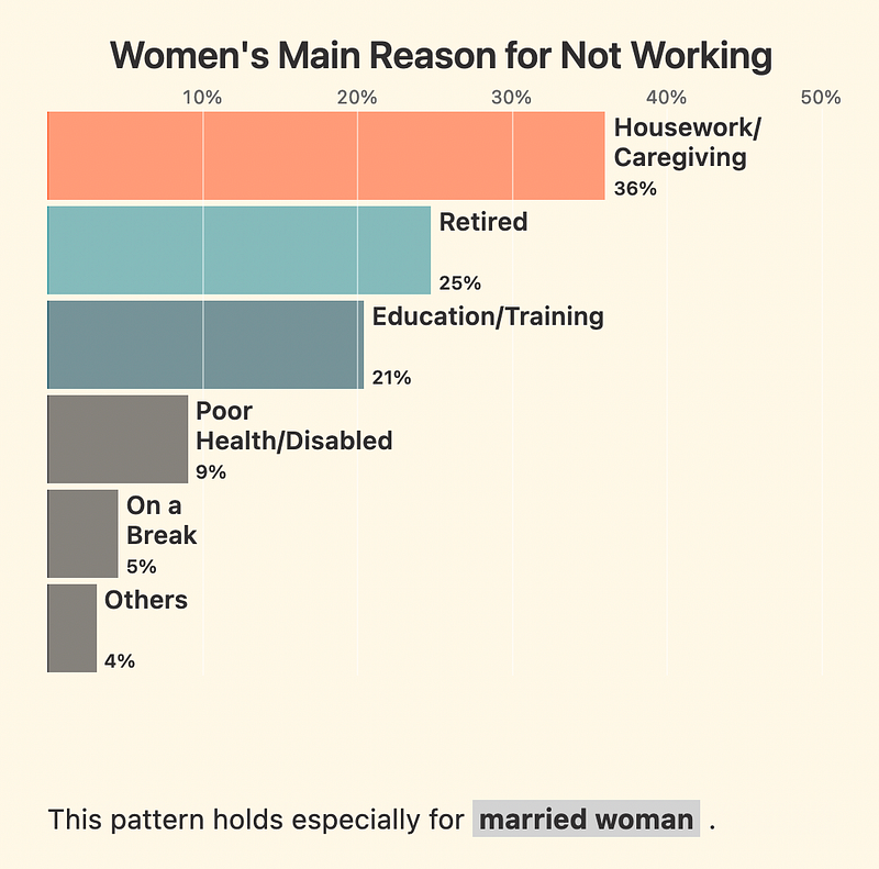 For subject matters, the ones that pique my curiosity are always the ones that shed a bit more light about what it means to be human. I like visualisations where the reader is invited to go through a journey, so that at the end of that visualisation, it helps them to think of what more there is to it. For instance, for the 2020 census, I wanted to avoid making sweeping claims about a charged topic like gender roles, and instead hone in on what the data was showing us about people’s experiences today. I was also hoping to make my reader ask, behind these numbers that we often take for granted, what else they are also saying about how we are as people. That’s the kind of reflection I’m hoping to prompt through my data viz.