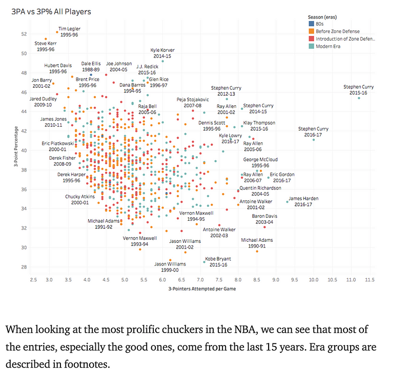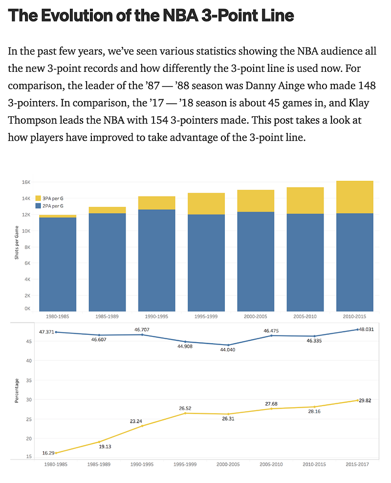 The bottom graph shows how the introduction of the 3-point line in the 1980 to 1981 season caused 3-point attempts and 3-point percentages to rise steadily, while 2-point shots per game remained relatively the same.