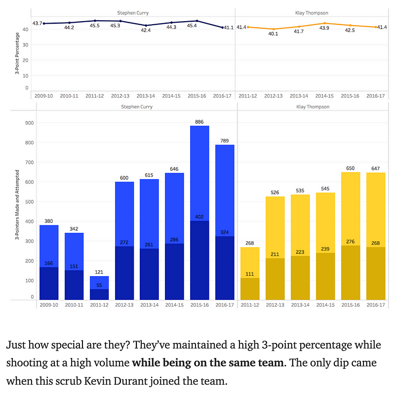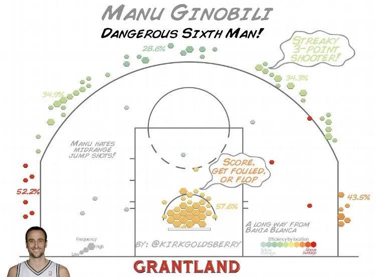 That’s actually where I found data visualisation to begin with. One of the sports writers I follow, Kirk Goldsberry, started mapping out where shots were happening on the basketball court. Once I saw that, I thought it was a really powerful way to show what was happening. He could explain a 5,000-word article in three pictures. Seeing how clear it was, especially for me as a visual learner, that’s when I went, “I get it now!” So it made a lot of sense for me to use this as practice.