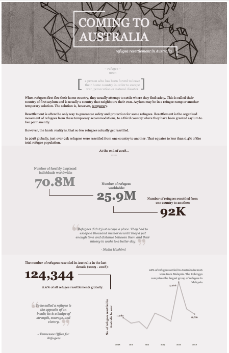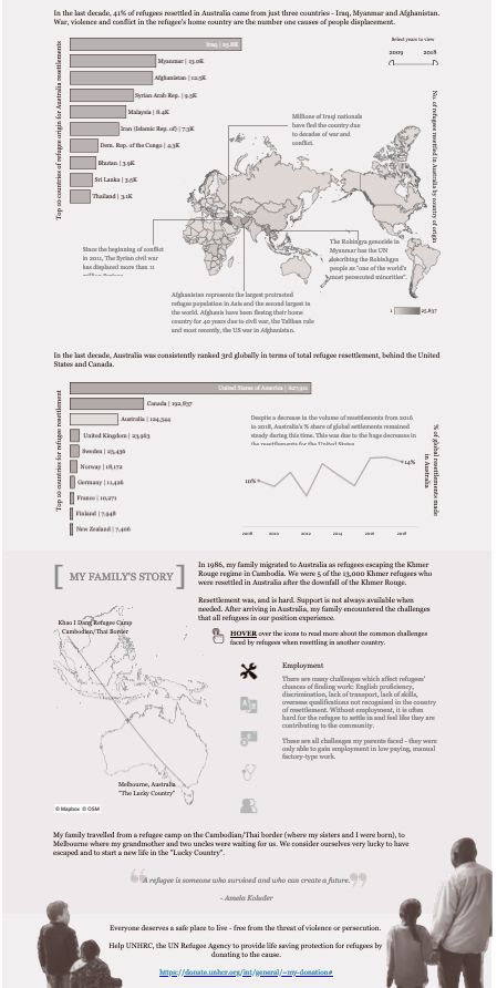 But there are also topics that I want to highlight to people and thus want to visualise. One of my recent visualisations was about refugees and refugee resettlement. It’s meant to show how once refugees are resettled, that’s not the end of the experience. There are many things that they experience once they’re in a new country, such as racism, discrimination, and language barriers — and I wanted to highlight that.
