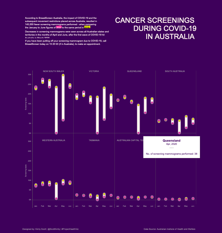 Another community project I worked on was the visualisation of cancer screenings during COVID-19 in Australia. This data was supplied to me — a lot of these initiatives supply data, but the data is usually UK- or US-based. Since this one was Australian data, which was less common, I was really keen to participate in the project.