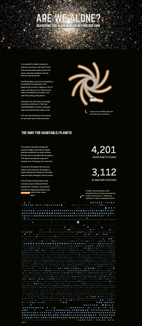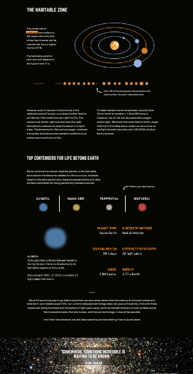 Then I started to play around with the data and came up with this idea — rather than looking at exoplanets and the constellations that they’re in, I asked the question: ‘Are we alone among these exoplanets? Could there potentially be life on these planets? How many planets are inhabitable zones? Which are the planets that could potentially support life?’ That’s how the theme evolved from my original concept to the final product.