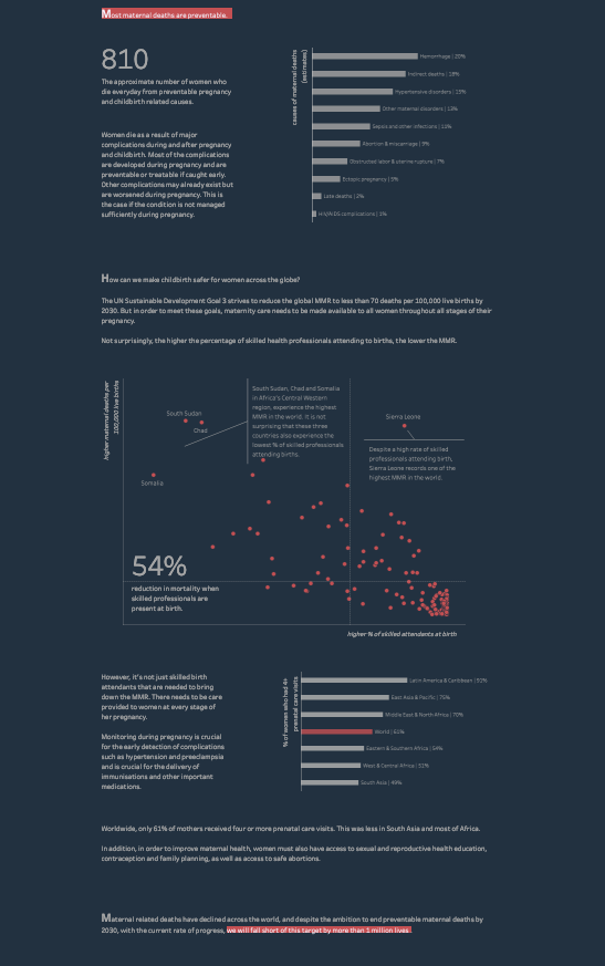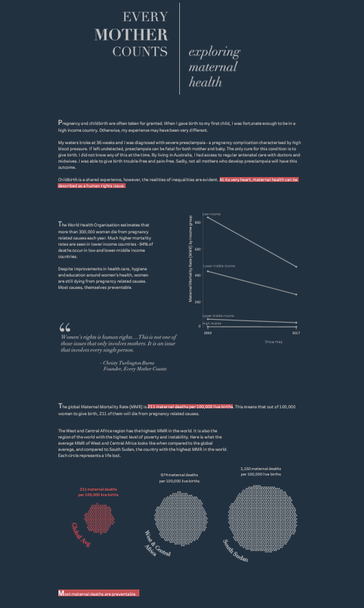 It’s all done outside of work hours. I work on my personal visualisations between 10 and 12 at night, which is the only time I have once my kids are in bed and I’ve watched a bit of Netflix to relax. Some of the longer form visualisations can take hours — I have to find the data, explore the data, come up with an idea or concept, and draw out a wireframe. The most recent long form viz I did was one titled ‘Every mother counts’, which looks at maternal health around the world. That took me two weeks in total. Even when the viz looks ready, I might sit on it for a day or two before going back to change something. That’s why some of my projects take a lot of time to reach the stage when I’m happy to publish them.