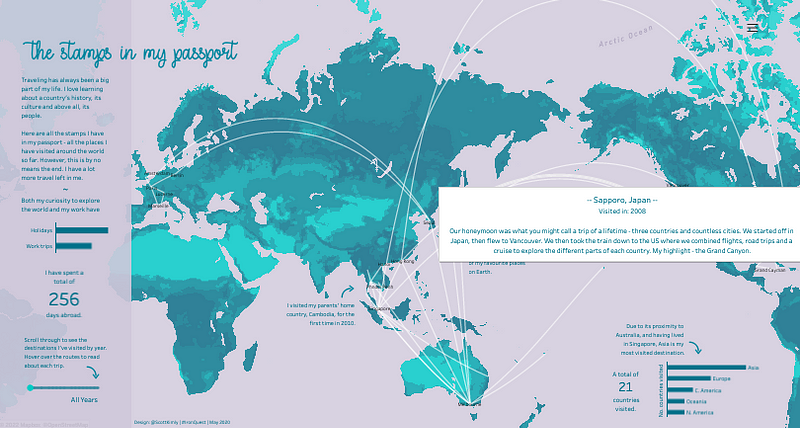 This was a viz I made for the “Quantified Self” project by Iron Quest. We were supposed to come up with and visualise our own data, such as fitness data from a Fitbit etc. I manually keyed into an Excel sheet, and visualised all the places in the world that I visited.