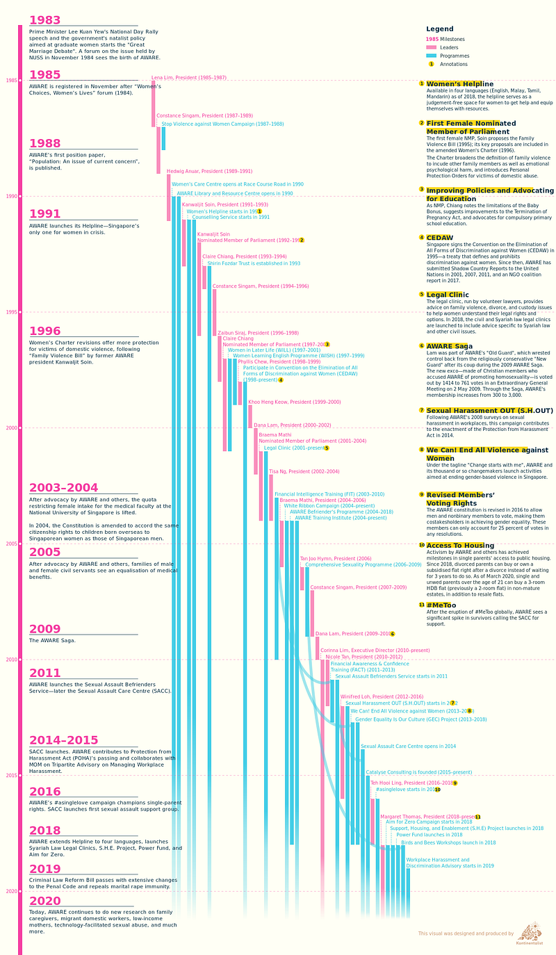 As the head of the company, it’s quite difficult for me to pick a favourite. Among the top pieces are our collaboration with BirdLife International and UNHCR. But if I had to choose, it would be Becoming AWARE. Working on this collaboration allowed me to use some of the historical research skills that I had picked up in university. It also expanded our team’s skillset in experimenting with static data visualisation and thinking beyond our usual formats and mediums. I was also incredibly proud to be part of a team that came together very quickly to work on the story in a short amount of time. Most important, it allowed me to feel like I’m part of something larger — supporting and celebrating women’s advocacy in Singapore.