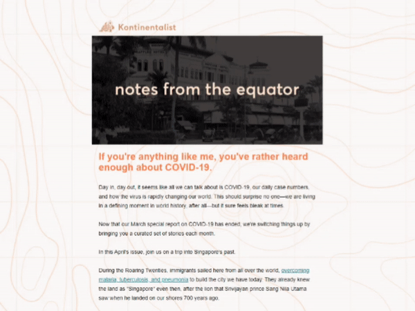 The newest iteration of notes from the equator is our attempt at bringing you something different. We want it to live up to its name, so that receiving the newsletter feels like receiving a postcard from a penpal in Singapore.