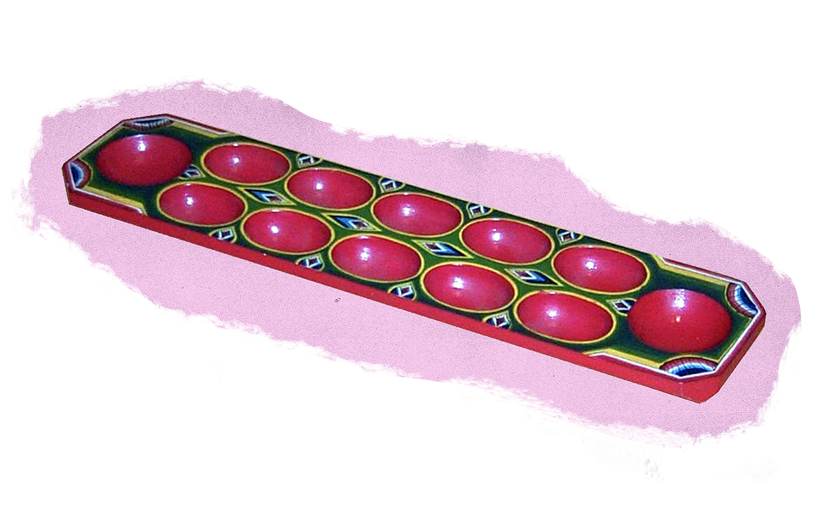 The game originates from the Arabian region, where it is known as “mancala”, or “to move”. It has different variations across Asia, Africa, and the Americas, mainly in terms of materials, design, and social settings. Boards might be carved from wood, drawn in sand, or made of stone or metal. Game pieces range from seeds and pebbles to shells and beads. In Indonesia, they might use cowrie shells, and boards are intricately carved to reflect the symbolic motifs of specific ethnic groups. In parts of the Malay archipelago, the game is played by women on the open verandahs of their kampong houses, turning gameplay into a communal, social activity.