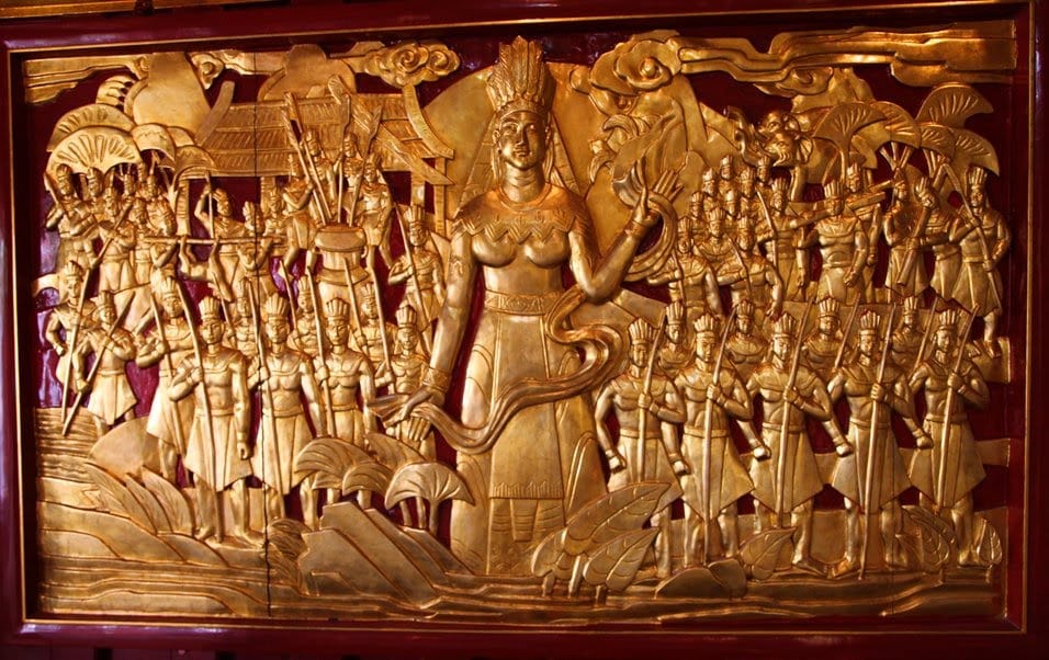 According to traditional Vietnamese folklore, Lạc Long Quân, a sea dragon lord, met and fell in love with Âu Cơ, a mountain princess. They married and had 100 children. However, they were incompatible as they belonged to different realms, and eventually parted ways, dividing their children equally between them. Lạc Long Quân returned to the sea with 50 children, while Âu Cơ settled in the Red River Delta with the remaining 50. One of her sons became the first Hùng King, who later ruled Văn Lang, said to be one of the earliest Vietnamese kingdoms, and established the ancestral lineage of the ethnic Vietnamese people.