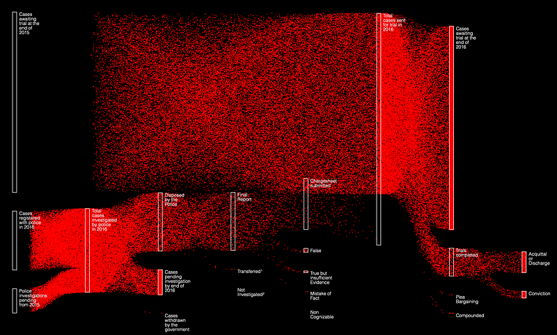 During my first data storytelling workshop with Konti, one of the data visualisations that hit me hard was a mobile Sankey graph in a story on rape in India. The massive movement of the 173,608 dots — coloured in a symbolic red — to show the different outcomes of rape crimes in 2016 drove home the severity and tragedy of the issue.