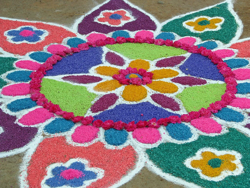 Kolam is a religious and ornamental design crafted on the floor of residences and entrances to public spaces during traditional Indian festivities. It is also known as rangoli in Gujarat and Maharashtra. Traditionally, the motifs were drawn with edible grains, coloured with dyes made from vegetable colouring, an act of charity encouraged in Hindu scriptures as the grains can then be eaten by insects. Aside from beautifying one’s home, the kolam’s main purpose is to drive away bad spirits and bring prosperity.