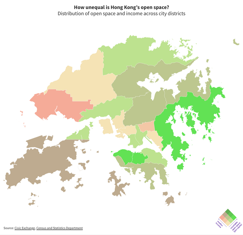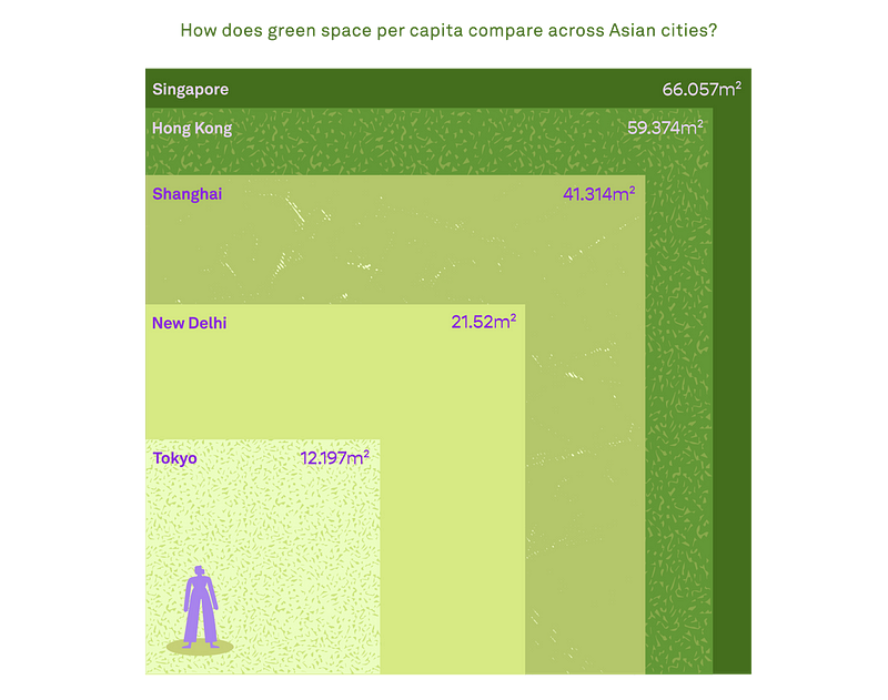 Our designer Munirah designed this box viz to show how green space per person differs across Asia’s cities, while our intern Zenn mapped income across the availability of open space in Hong Kong.
